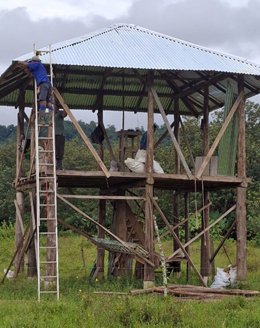 Auf der Hacienda El Dorado ist das neue Rancho fast fertiggestellt. Nach Beratung mit Biolog*innen wurde es strategisch zwischen Weideland und Lagune errichtet, sodass Tiere der Offenlandschaften und Feuchtgebiete ungestört beobachtet werden können.