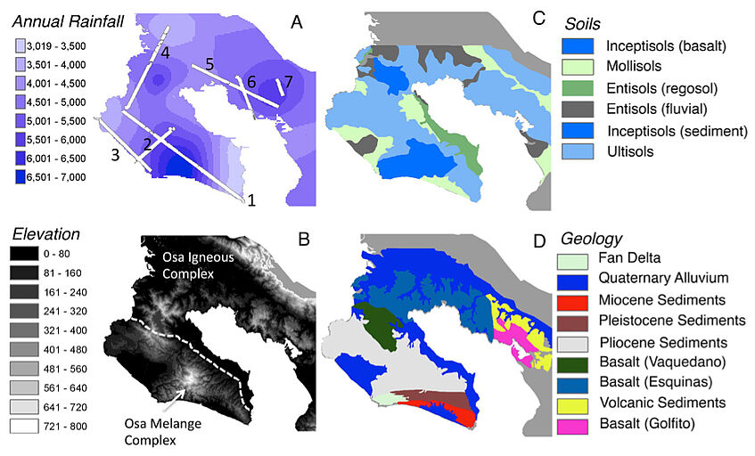 Albeit the fact that tropical forests store large amounts of carbon (C) in aboveground tree biomass, the mechanistic controls on forest C stocks remain poorly resolved. To date, one of the key factors limiting our current knowledge of tropical forest ecosystem responses to projected environmental changes (such as increasing atmospheric CO2, increasing temperatures and prolonged drought periods) is the lack of a mechanistic understanding of how the controlling state factors (e.g. climate, geology, time and biota) determine the distribution of aboveground C stocks at the landscape-scale. Here, we aim at unraveling the mechanistic links between environmental controls such as edaphic factors (i.e. soil type, topographic position) and climatic drivers (i.e. temperature, precipitation), and demographic parameters (species composition and vegetation structure) and how they determine tropical aboveground C stocks at the landscape-scale. To that end, we will be investigating species composition and vegetation structure of >10.000 tree individuals that have been mapped and identified in 20 one-hectare plots established across edaphic and topographic gradients on the OSA peninsula, Costa Rica.